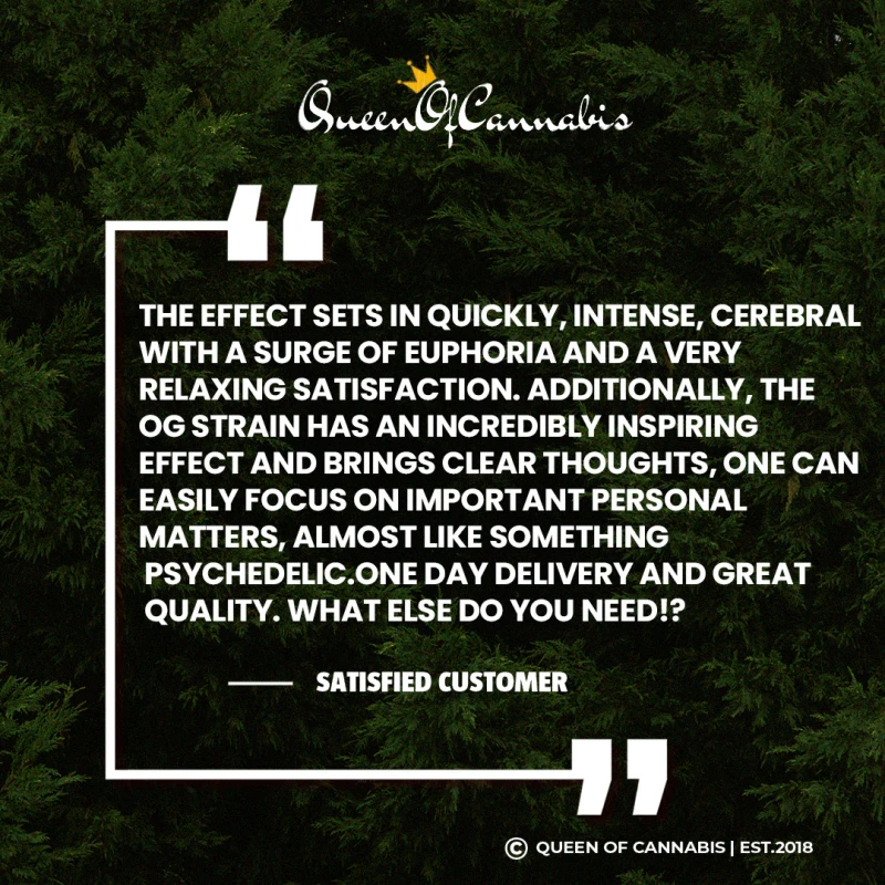OG Kush, die legendäre Sorte im mysteriösen Gewand, ist eine fesselnde Hybrid-Sorte, die sowohl sativa- als auch indica-Qualitäten vereint und eine sofortige Welle der Euphorie und seligen Entspannung hervorruft. Mit ihrem renommierten Ruf in der Welt der medizinischen Marihuana verführt OG Kush zu sozialen Interaktionen und löst Lachanfälle sowie einen unstillbaren Appetit aus. Mit einem beeindruckenden THC-Gehalt und einer vielfältigen Palette therapeutischer Vorteile ist diese Sorte ein bewährtes Mittel gegen chronischen Stress, Angstzustände, Stimmungsschwankungen, Appetitlosigkeit und Migräne. Bereite dich darauf vor, mit OG Kush an Deiner Seite eine Reise zu erhöhtem Wohlbefinden anzutreten.