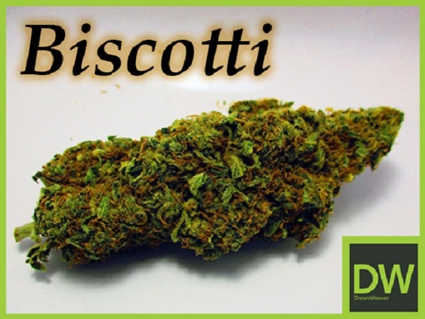 Biscotti is a rare indica dominant hybrid strain (80% indica/20% sativa) created through a delicious cross of the classic Gelato #25 X Girl Scout Cookies X South Florida OG strains. If you're looking for a classic indica with an insanely delicious flavor, you've found it. Biscotti packs everything you want and more in the effects and taste department into each delicious toke, all fueled by a super high 25% average THC level. The Biscotti high comes on with a rush of cerebral effects that launch your mind into a pure lifted state of unfocused bliss. As your mind settles, a calming body high will wash over our physical form, allowing you to kick back and relax without a care in the world. This high will quickly become giggly and stoney, leaving you laughing at anything and everything around you. Thanks to these effects and its high THC level, Biscotti is often chosen to treat conditions such as chronic stress or anxiety, depression, mood swings, and chronic pain. This bud has an insanely delicious sugary cookie flavor with a rich spicy exhale. The aroma is of earthy herbs and fruits with a notable cookie effect. Biscotti buds have spade-shaped dark olive green nugs with long dark orange hairs and a thick frosty coating of bright white crystal trichomes.