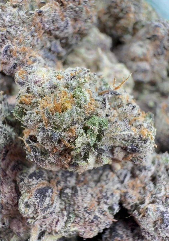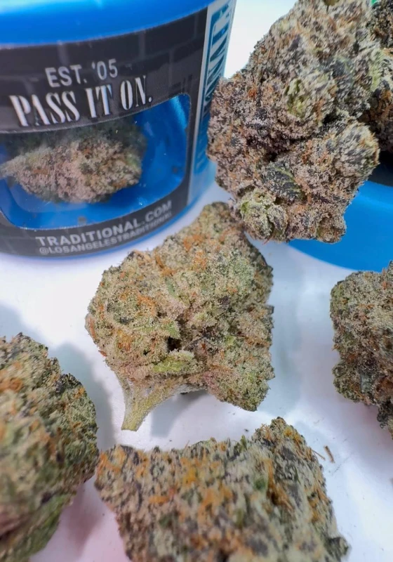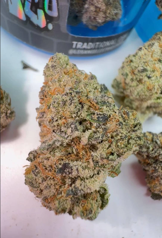 "Spray Paint" is a wizard tier strain grown by "Traditional" - This strain is one of their main starters in their lineup, meaning it has its own jar! "Spray Paint" is an indica-dominant hybrid, made from crossing "OG" x "Gelato" - "This fusion offers an earthy, cakey, and gassy flavored smoke with a piney exhale. Its effects are purported to be appetite stimulating and euphoric, transitioning to a relaxing vibe. Beautiful, vibrant, different shades of all colors! It is a gorgeous mix of mostly indigo-colored purple, a light lime green, snow colored frost covering the whole nug, and a bunch of orange hairs! A beautiful mix of vibrant colors all over this cakey ball of frost! The nugs are so light, yet dense - So fluffy and squishy, yet solid - These are some of, if not, the best flowers of all time! Nug size is literally perfect, every nug looks as it should; Pretty much a large medium sized nug! This strain is a straight flex! Roll it up with your favorite wizard bros, and immediately watch everyone tap out! "Spray Paint" by "Traditional" is one of the best strains of all time; These flowers are so strong, clean, and pure - 10/10 nose, taste, and overall structure!