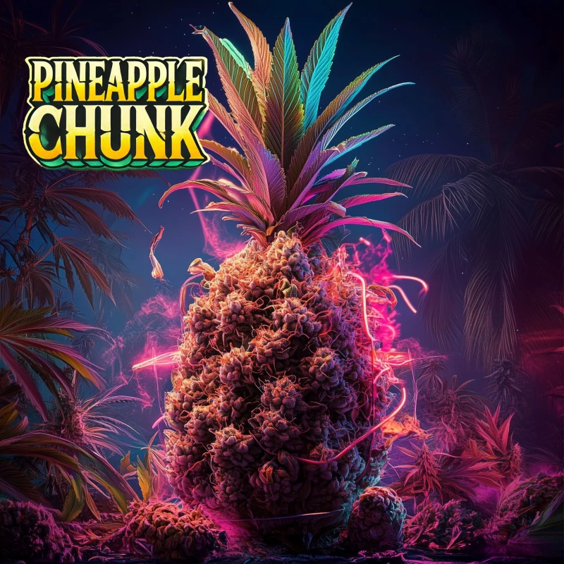 "The essence and flavour of Pineapple Chunk strain is immediately obvious. Its aroma of earthy Cheese X Skunk is fortified by the stunning essence of very sweet Pineapple. The taste is delicious and unique. Earthy flavours are underpinned by the strong appetizing Pineapple aftershock. A huge giver with a massive THC output and high CBD giving a powerful couch lock effect."