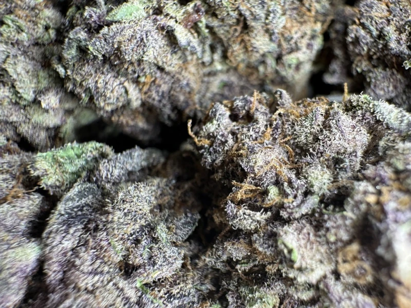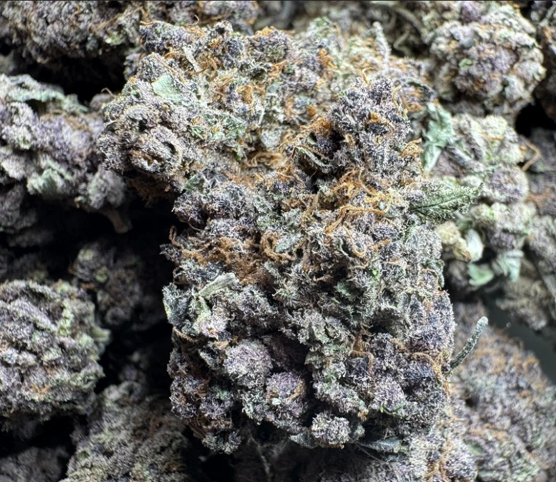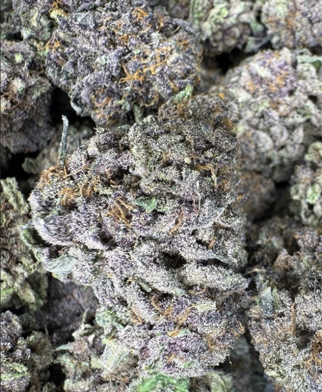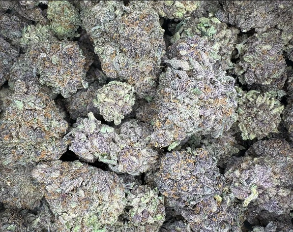 Die Buds bestehend aus dichten, traubenförmigen, Pink/Lila bis leuchtend neongrünen Knospen mit dunkelvioletten bis giftgrünen Untertönen, dünnen, orangefarbenen Haaren und einer Beschichtung aus frostigen, klobigen, lila-weiß getönten Trichomen.