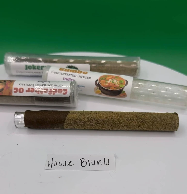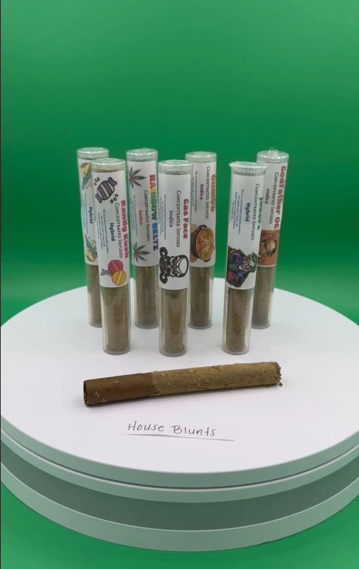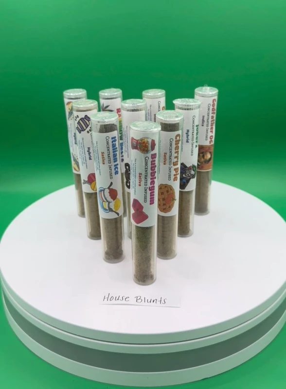 -Introducing our official "PP Brand" Blunts! It’s really not branded like you’d think, so you can turn this into your own brand if looking to do so, but this is still the pp brand! Filled with over 2 grams of flower, and around a quarter gram of concentrate (sugar or crumble-depending on the strain // THCa diamonds for WIZARD tier), and covered in kief! The blunt paper is not tobacco, but is rolled in a hemp wrap .. We use glass tips on our mouthpieces - All blunts come packaged with the strain-name label printed onto a clear tube! These are easy flips for you trappers or for personal smoke! Great for on-the-go or for you wtiches who too lazy to roll up!