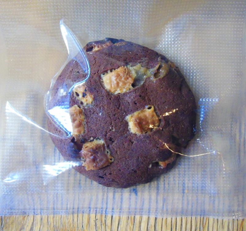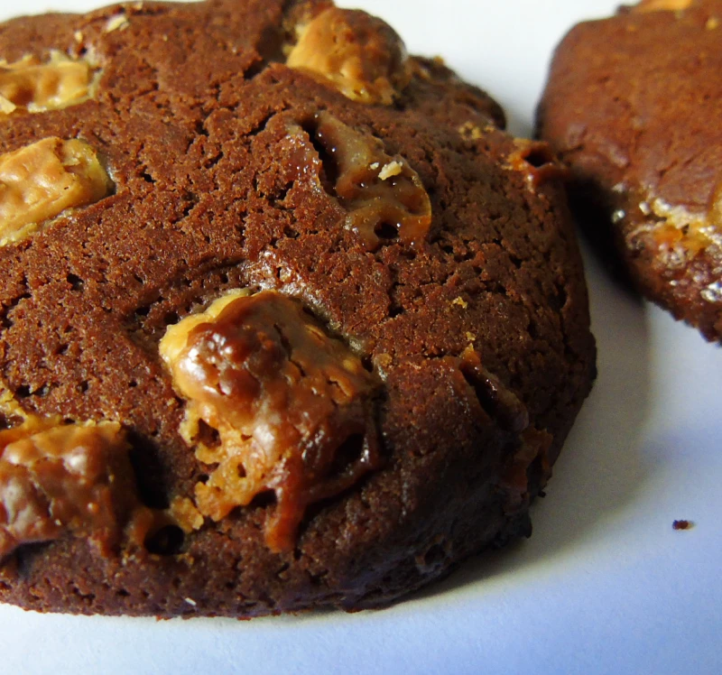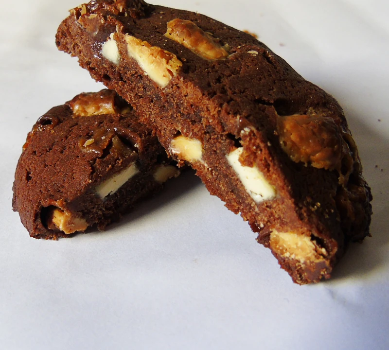 The cookies consist of a dough made from dark cocoa mass, flour and other additives. Chunks of white chocolate are worked into the dough. The cookies are a little crispy on the outside and a little softer in the middle. Yamyamyam.